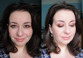 I've added a touch of a darker brown in the crease, and along the upper lash area, but this is just one coat that I've sheered out a little with my fingertips towards the socket line. The green flash is far more visible in the flesh. The shadows do dry quickly so you have work quite quickly, but they are long lasting, and hard wearing, and will last a full work day without wearing off.
